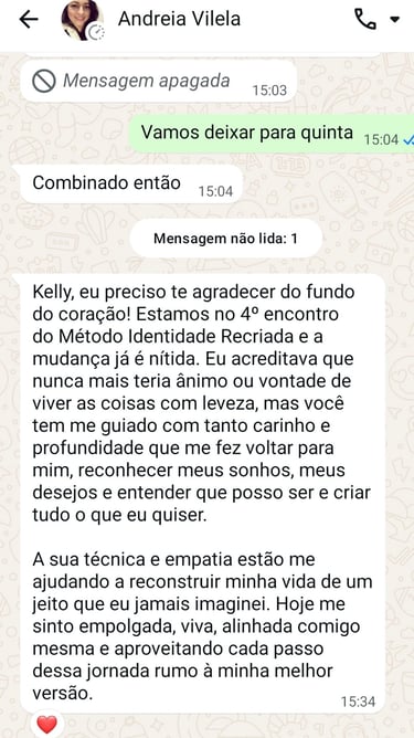 Hoje sou Terapeuta e Mentora e com a experiência que passei nasceu o MÉTODO IDENTIDADE RECRIADA.